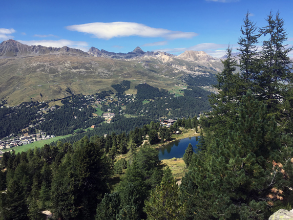 Nach der Rast geht es auf der anderen Seeseite Richtung Silvaplana hinunter. Zuerst recht steil, mit wunderschöner Aussicht auf den Silvaplanasee, und nach ein paar Minuten dann auf einem Wirtschaftsweg. Von hier aus kann man bis nach Silvaplana wandern oder direkt zurück bis nach Champfèr.